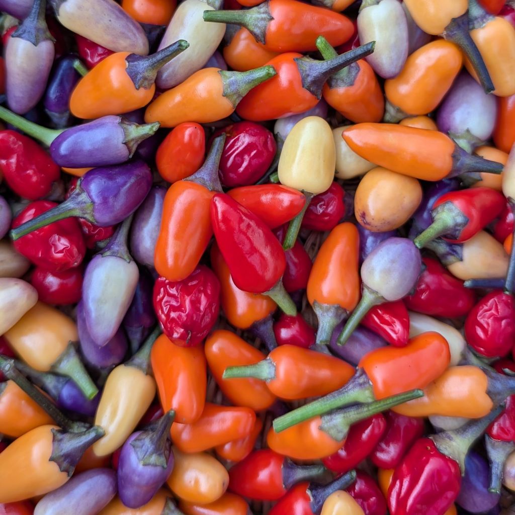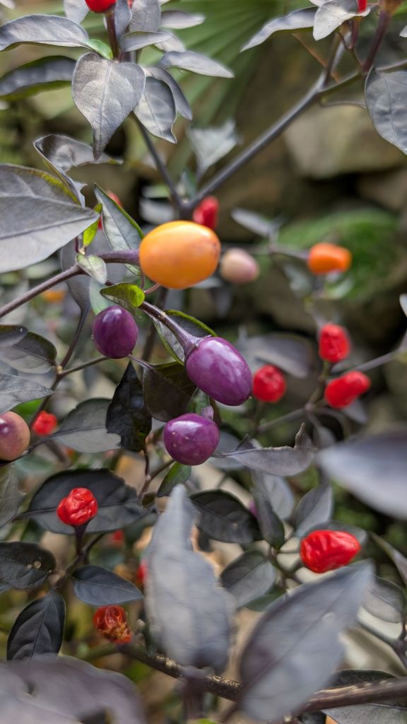 Diese Chili-Sorte ist eine Augenweide: violette Blätter, lila Blüten und mehrfarbige Früchte, die sich von Violett über Gelb und Orange bis Rot färben. Ein echtes Farbfeuerwerk – und das das ganze Jahr über.