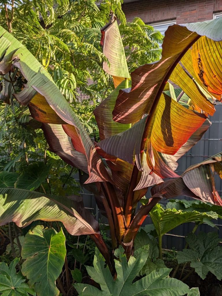 Die rote Zierbanane gehört nicht zu den klassischen Bananen (Musa), sondern zu Ensete. Sie bildet also keine essbaren Früchte, beeindruckt aber mit ihren riesigen Blättern, die sich in der Sonne rot, bronzefarben und grün schimmernd zeigen.