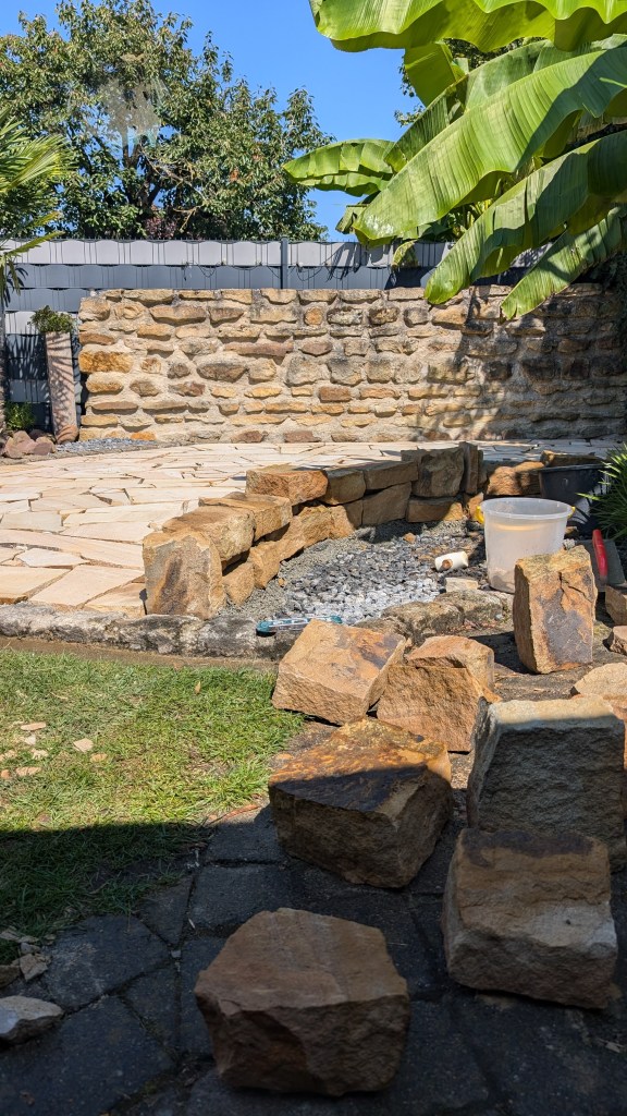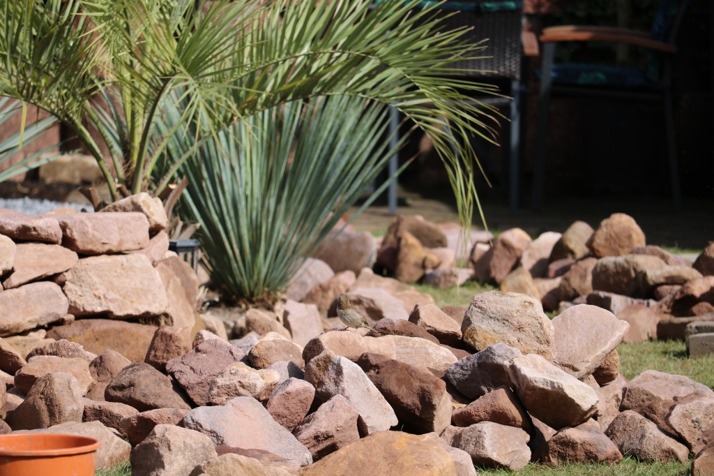 Wir haben uns vorgestellt die unterschiedlichen Bereiche das Gartens mit Sandsteinmauern abzugrenzen. Also wurden in den letzten drei Jahren ca. 20 Tonnen Sandsteine aus einem nahegelegenen Sandsteinbruch geliefert. Jeden einzelnen Stein hat Andre in den Garten getragen und zu Trockenmauern verarbeitet. Sprich ohne Mörtel oder sonstiges aufeinander geschichtet, damit gleichzeitig Lebensraum entsteht.
