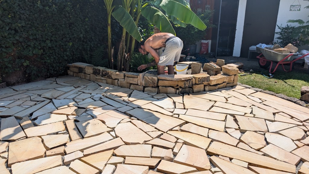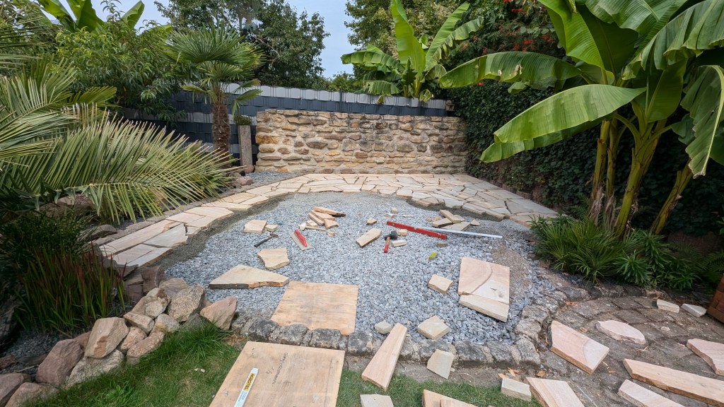 Im Jahr 2024 hatten wir dann genug von der Schotterterrasse und haben in kompletter Eigenregie an dieser Stelle eine Sandsteinterrasse gepflastert. Auslöser dafür war die unerwartete Teilnahme an einer Fernsehsendung. Mehr dazu, wenn du auf den Button klickst 🙂